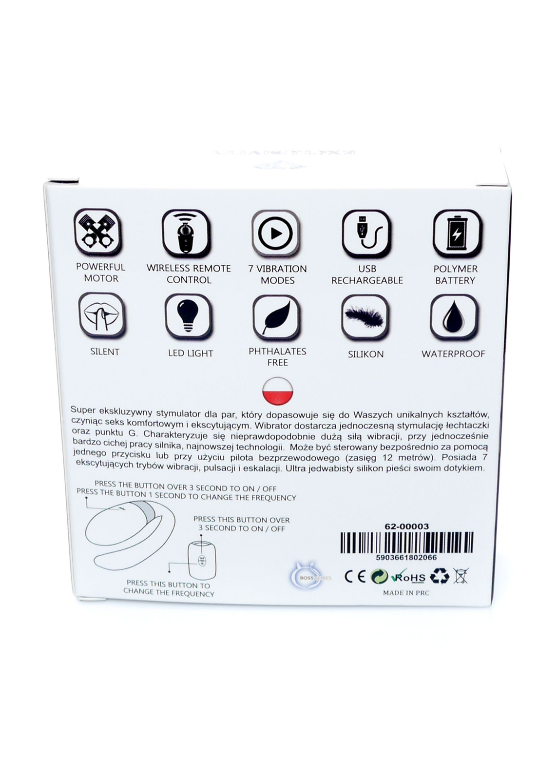 Super ekskluzywny stymulator dla par, który dopasowuje się do Waszych unikalnych kształtów, czyniąc seks komfortowym i ekscytującym. Wibrator dostarcza jednoczesną stymulację łechtaczki oraz punktu G. Partnerka umieszcza wibrator w pochwie w taki sposób, by jedna część znajdowała się wewnątrz (stymulacja punktu G), a druga na zewnątrz (stymulacja łechtaczki). V-vibe może być wykorzystywany podczas stosunku z partnerem, który także będzie odczuwał przyjemne wibracje w trakcie seksu. Rodzaj wibracji, jak i ich intensywność mogą być regulowane przy pomocy bezprzewodowego pilota. Charakteryzuje się nieprawdopodobnie dużą siłą wibracji, przy jednocześnie bardzo cichej pracy silnika, najnowszej technologii. Może być sterowany bezpośrednio za pomocą jednego przycisku lub przy użyciu pilota bezprzewodowego (zasięg 12 metrów). Posiada 7 ekscytujących trybów wibracji, pulsacji i eskalacji. Ultra jedwabisty silikon pieści swoim dotykiem. Ledowe podświetlanie, ładowany za pomocą kabla USB (w zestawie).