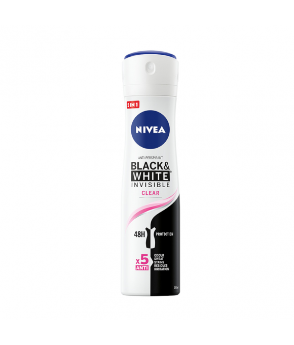 NIVEA Black&White Invisible Clear Antyperspirant to produkt, który zapewni Ci skuteczną i niezawodną ochronę przed poceniem się, bez ryzyka pobrudzenia Twoich ulubionych ubrań. Zapewnia ochronę 5w1 i chroni przed nieprzyjemnym zapachem, poceniem, żółtymi plamami, białymi śladami oraz przed podrażnieniami. Antyperspirant nie pozostawia żółtych plam na białych ubraniach ani białych śladów na czarnych. Unikalna formuła chroni Cię przed nadmiernym poceniem się przez 48 godzin, jednocześnie pielęgnując Twoją skórę. Delikatny i kobiecy zapach zapewnia uczucie świeżości. Jego łagodność dla skóry została potwierdzona dermatologicznie.