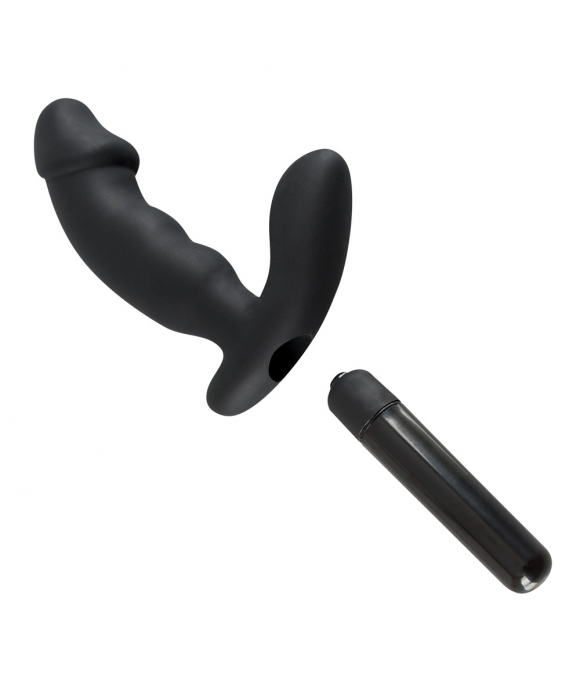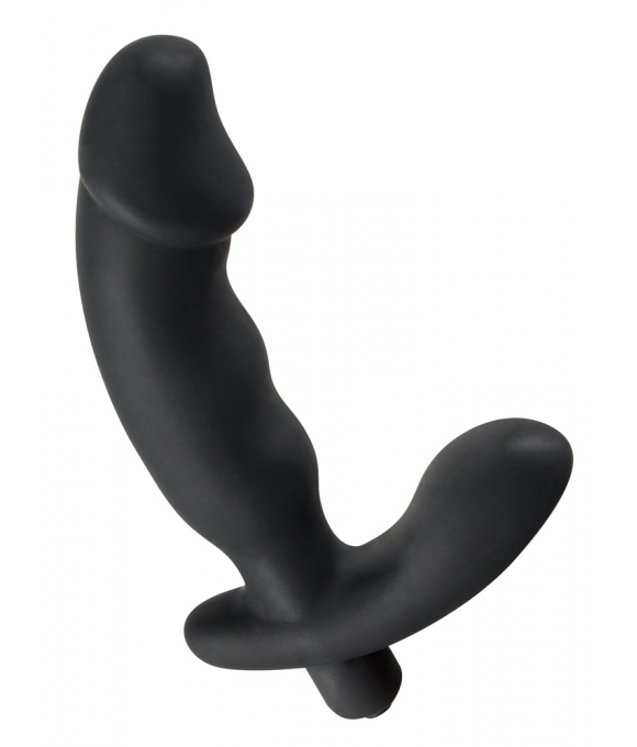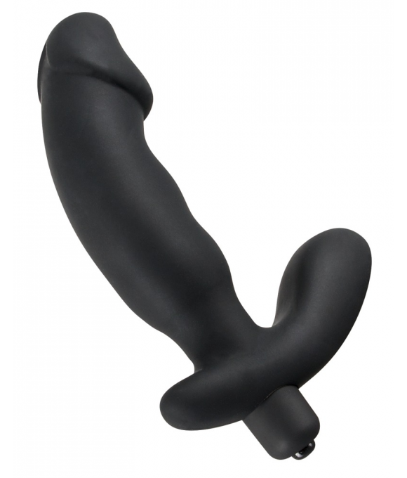 Ten czarny wibrator z lekko pofalowanym trzonkiem i dużym żołędziem ma dodatek w postaci stymulatora krocza.