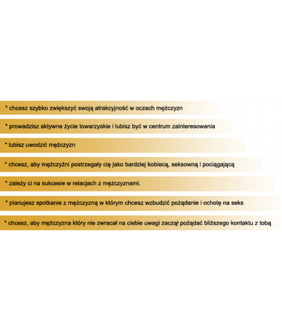 • Ekscytujący zapach wywołuje w mężczyznach pożądanie i erotyczne podniecenie, któremu nie są w stanie się oprzeć.