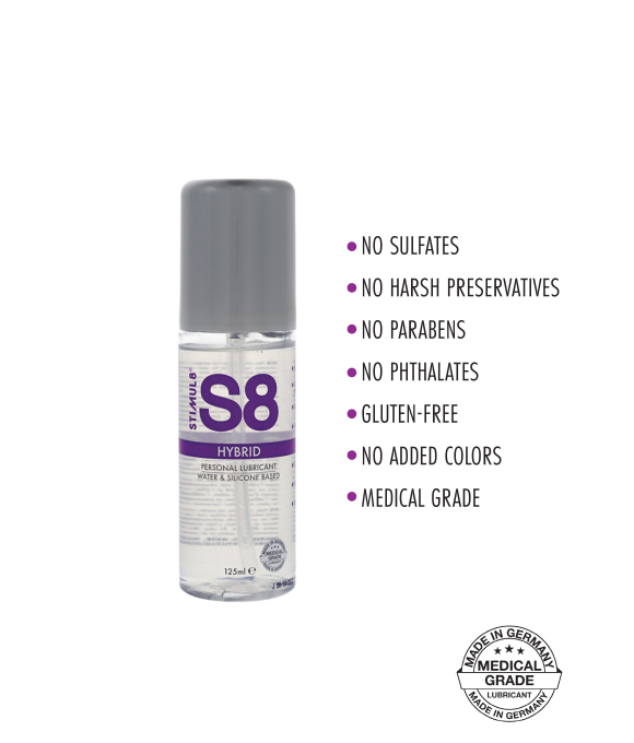 The premium S8 Hybrid Lubricant is the perfect match for consumers who don’t want to comprise: as it combines the silky glide of silicone lubricants with the easily clean-up of water-based formulas. To keep its appeal as ‘natural’ as possible, the Hybrid lubricant is paraben-free, phthalate-free, gluten-free, sulfate-free and contains no added colors or harsh preservatives. With medical-grade approval, the S8 Hybrid Lubricant also adheres to all current EU-regulations regarding intimate care products and makes a trustworthy, competitive-priced and transparent alternative to other, non-approved choices on the market.