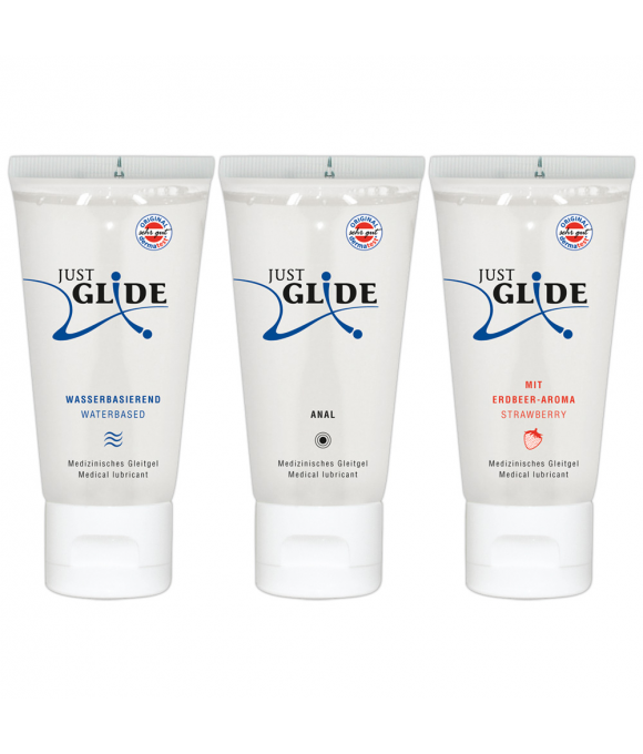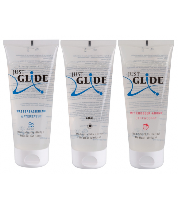 The big Just Glide set at a special price! 3 Just Glide lubricants in one economy pack. The water-based lubricant is 100% vegan and is also suitable for sensitive skin. Non-greasy and free from oil. Washable. Safe to use with latex condoms. 3 x 200 ml »Waterbased«, »Strawberry« and »Anal«.