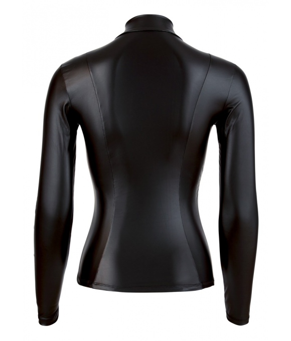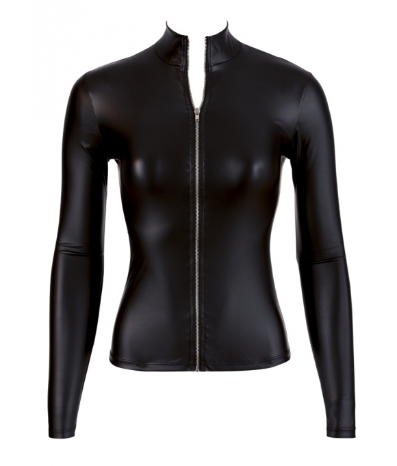 Skin tight and extremely sexy! Which man doesn't love hot curves?! This black top emphasises your sexy curves without revealing too much. This high neck top has a small stand-up collar and long sleeves. This shiny matte top really is anything but boring because it is skin tight and fitted at the waist. Unzip the full-length, silver-coloured zip slowly and reveal what's underneath – you will drive your partner wild…90% polyester, 10% spandex.