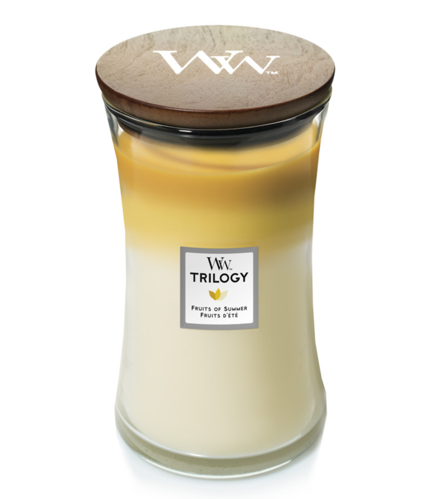 WoodWick TRILOGY FRUITS OF SUMMERS to trzy warstwy koloru i aromatu, które połączono, aby stworzyć jedną piękną świecę. Każda z nich posiada unikalną kompozycję wosków, które topiąc się uwalniają wyjątkowy zapach: Pineapple, Lemon, Coconut.