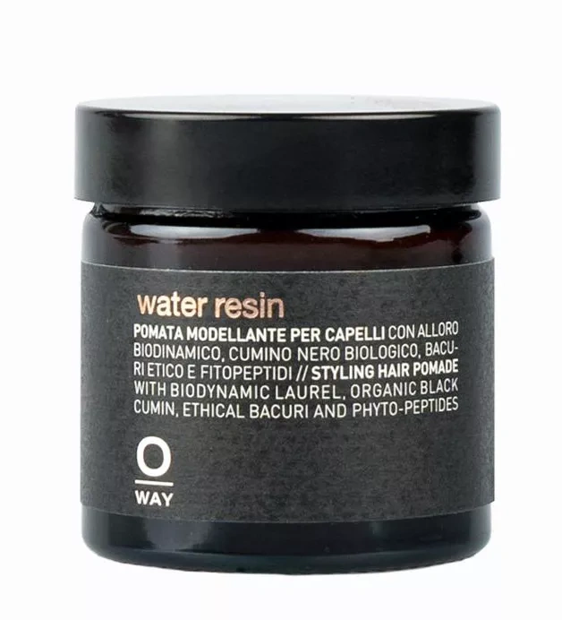 Oway Water Resin to profesjonalna, wodna pomada do włosów, która łączy stylizację z intensywną pielęgnacją wzmacniającą. Zapewnia elastyczne utrwalenie i naturalny blask, pozwalając na modelowanie zarówno gładkich fryzur typu „wet look”, jak i podkreślenie skrętu loków. Formuła wzbogacona o biodynamiczny laur, organiczny czarny kminek i masło bacuri głęboko odżywia oraz chroni strukturę włosa przed czynnikami zewnętrznymi. Dzięki zawartości fitopeptydów produkt dodatkowo zagęszcza i wzmacnia pasma, nadając im zdrową objętość bez efektu obciążenia. Jest wolna od parabenów i sztucznych barwników, co czyni ją idealnym wyborem dla osób ceniących naturalny skład i ekologiczne opakowania. Produkt jest niezwykle wydajny i łatwo zmywa się samą wodą, nie pozostawiając osadów na włosach.