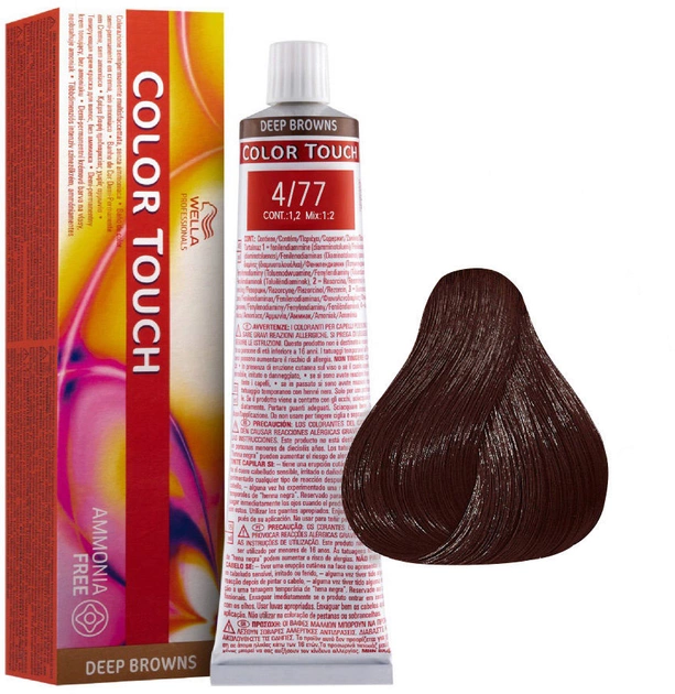 Wella Color Touch Ammonia Free 4/77 Deep Browns — półtrwała, profesjonalna farba tonująca bez amoniaku, oferująca średni brąz o głębi i blasku. Dzięki formułom Light2 Color Complex, naturalnym woskom i keratynie, farba zapewnia trwałość nawet do 24 myć, intensywny połysk oraz pokrycie siwizny do 50%, jednocześnie pielęgnując strukturę włosów.
