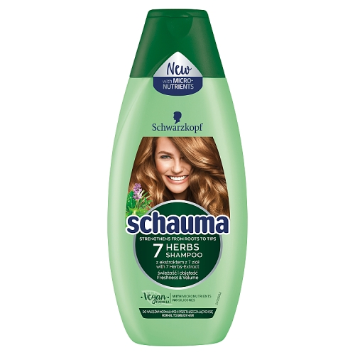 Szampon 7 Ziół świeżość i objętość do włosów normalnych po szybko przetłuszczające się. Formuła z ekstraktami z 7 ziół zapewnia włosom świeżość, pielęgnację i naturalną objętość. Formuła z intensywnie wzmacniającą proteiną przywraca włosom utraconą substancję dla 100% siły i 100% blasku.