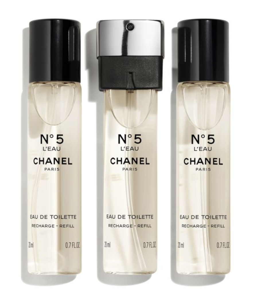 Chanel No 5 L'Eau marki Chanel to kwiatowo - aldehydowe perfumy dla kobiet. Nuty zapachowe: nuty głowy: aldehydy, cytryna, neroli, mandarynka, pomarańcza, bergamotka lima nuty serca: Ylang-ylang, jaśmin, róża majowa nuty bazy: białe piżmo, korzeń irysa, cedr i wanilia. Wkłady 3x20 ml